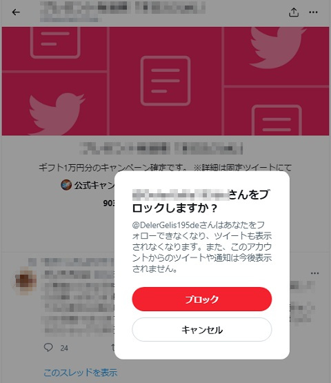 Twitterで初めてブロック操作をする。なんかいい練習になったありがとう詐欺アカウント