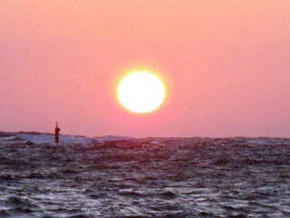 仕方ないので宮城島まで南下。でも、途中横道にそれて堤防っぽいつくりの場所があったので、そこに車を止める。そして堤防の先にドカッと座り込む。いや、なんか波が高くて、立ってたら海に落ちそうな錯覚に襲われたのですよ。日の出は…間に合いました。そして恒例の海に浸か…いや無理。ここは前浜ビーチ以上に無理。というかビーチじゃないし。足に浸かるのも怖いので手でちょっと海水触って終了しました。あぁ怖かった。