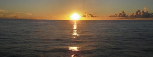 なんとなく目覚める。時間は午前5時。折角起きれたし朝日も見るか。ということでまたデッキへ。今度は人がまばらだった。まあ早朝だしな。と思ったらそれだけでなく雨まで降ってた。うーむ、これじゃ朝日拝めないかな。いやもしかしたらと一縷の望みを託すも、やっぱダメでした。でもしばらくしたら、雲の切れ間から日が昇りきった太陽が出てきたのでそれで納得する。