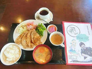 そこから階段を下りてホールへ。とりあえず生姜焼き定食が美味しそうだったのでそれで。メニューにまで塩原ちゃん。ガチすぎる。