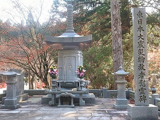 震災の慰霊碑に手を合わせ